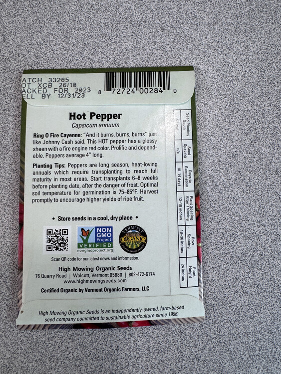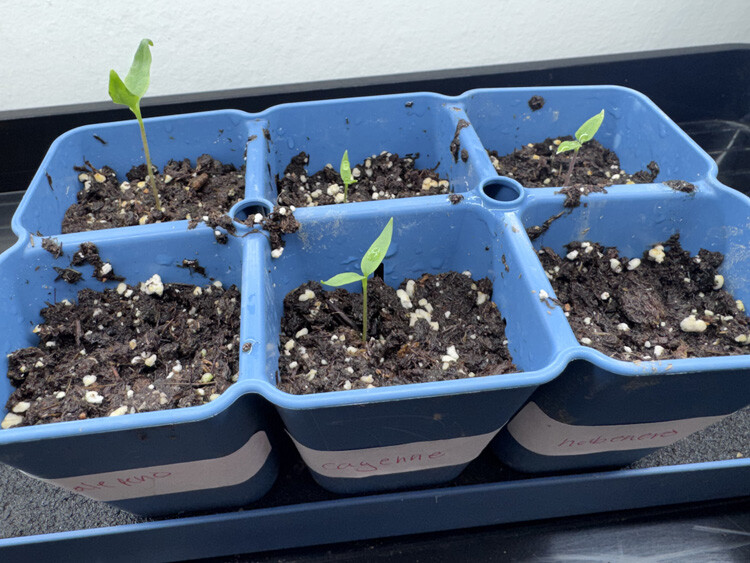 Planting Depth: 1/4″ Germination: 12-14 Notable Dates: February 1 Seed Starting May 10 Transplant Seed Supplier: High Mowing Organic Week 1 seedlings (2026) jalepeƱo, cayenne, habanero pepper seedlings week 5 2025 Notes: Took about 10 days to germinate